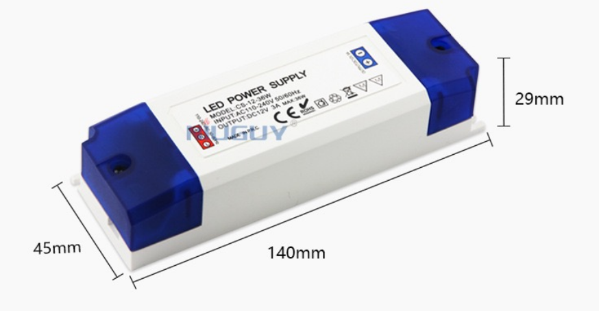 | CS-12-36W | 100-240V~50/60Hz 0.8A max | 12VDC | 3.0A | 36W-max Load 80% | IP20 | ABS | 140*45*29mm |