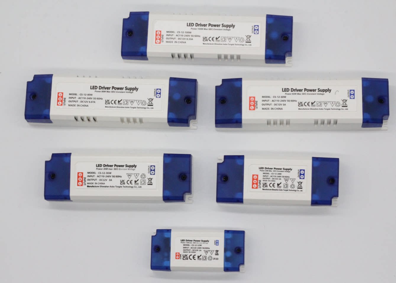 | CS-12-80W | 100-240V~50/60Hz 1.2A max | 12VDC | 6.67A | 80W-max Load 80% | IP20 | ABS | 165*45*30mm |