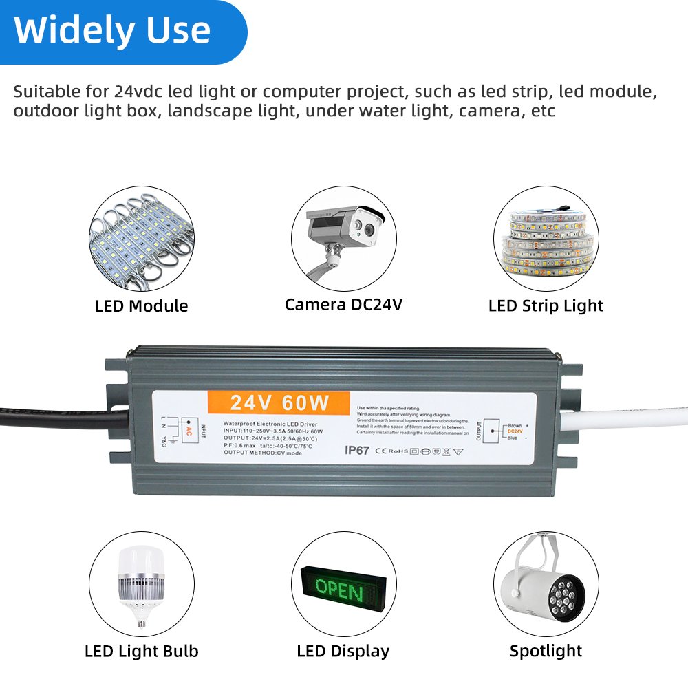 This 60W constant voltage LED driver operates 90V-130V or 170-250VAC input range. The LED driver provides 24V constant voltage which is suitable for both LED lighting or CCTV camera.