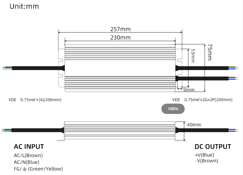 | 300W | 230*75*40 | 90V-130V/170-250V | IP67 | 12V 300W | 12V | 25A | 10 |