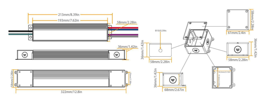 The 5 in 1 dimmable led driver series 40w~320w is 100-277vac 12vdc/24vdc/36vdc/48vdc output with detachable junction box.